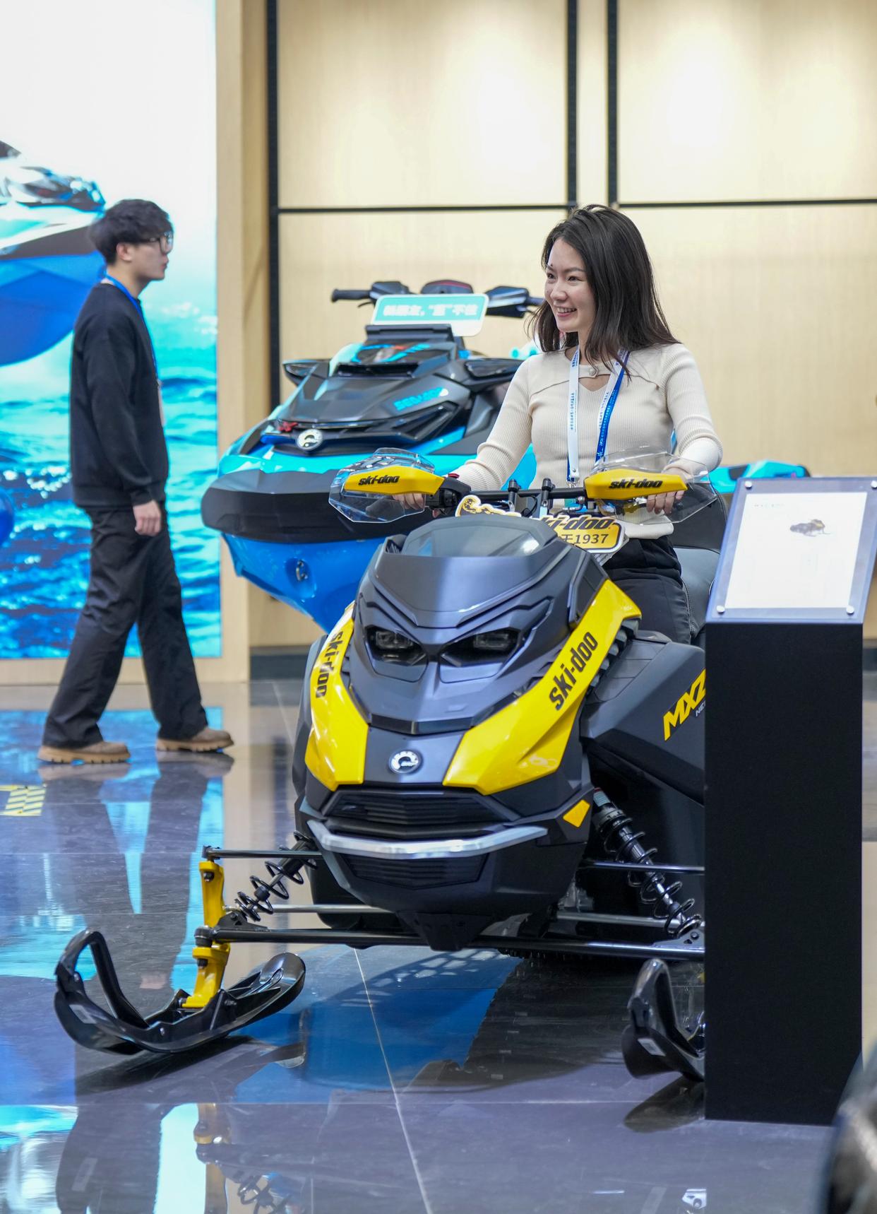 1月6日,在2026哈尔滨国际冰雪经济博览会展会现场,参观者体验乘坐雪地摩托。新华社记者 王松 摄