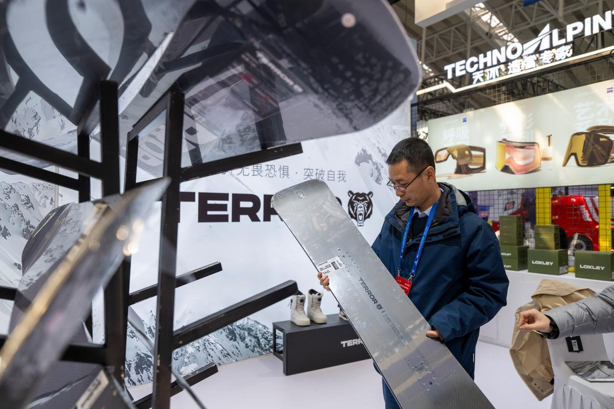 1月6日,参会嘉宾在2026哈尔滨国际冰雪经济博览会现场观看滑雪板。新华社记者 张涛 摄