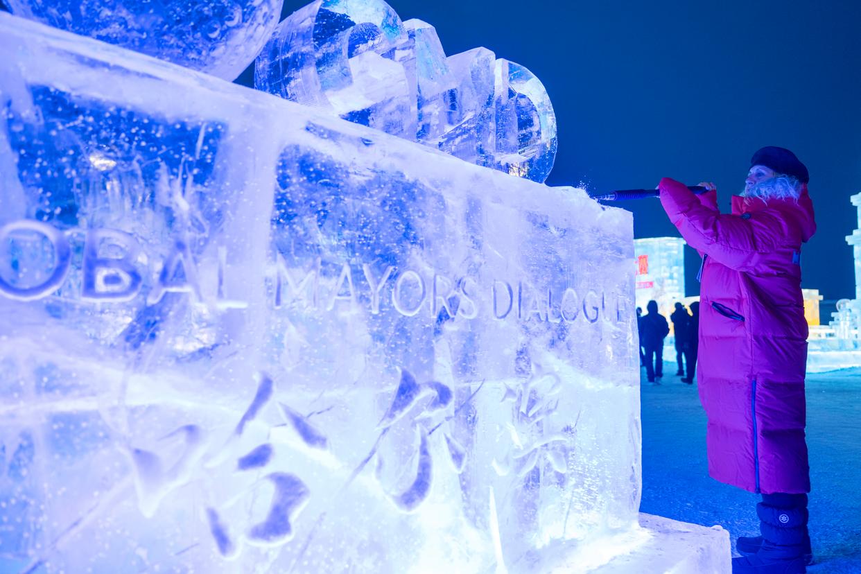 1月6日,嘉宾在“世界市长对话·哈尔滨”活动启幕仪式后体验雕刻冰雕。新华社记者 张涛 摄