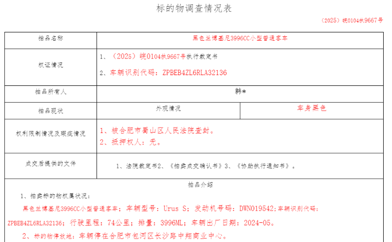 拍卖信息显示,这四辆兰博基尼UrusS均为合肥市蜀山区人民法院查封车辆,所有人为被执行人韩某。其中,两辆黄色UrusS均以275万元成交;一辆黑色UrusS以279万元成交,为本次最高成交价;另一辆灰色UrusS则以271万元成交,为本次最低成交价。