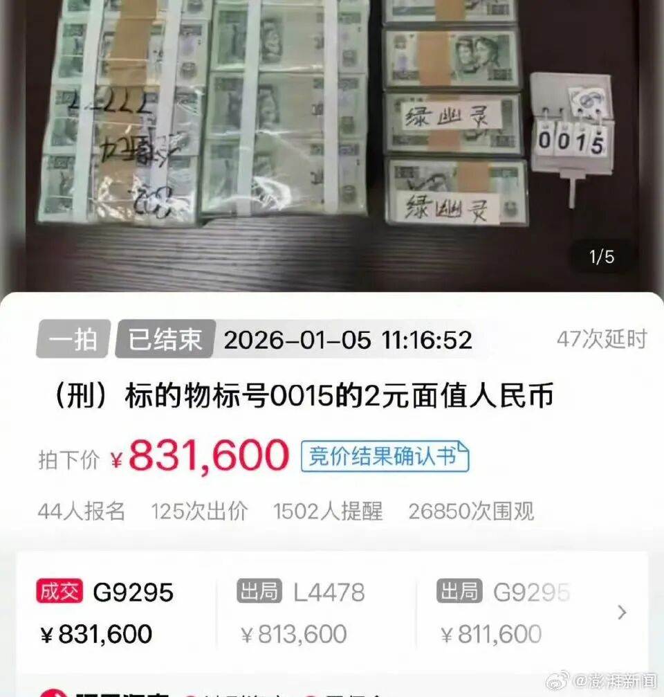 1月4日上午,浙江温州永嘉县人民法院以20.76万元的起拍价,在阿里法拍平台拍卖10500张2元面值人民币,引来44人争抢。澎湃新闻从法拍平台了解到,5日11时11分,该标的物经过125次出价,以831600元的价格成交,溢价约4倍。