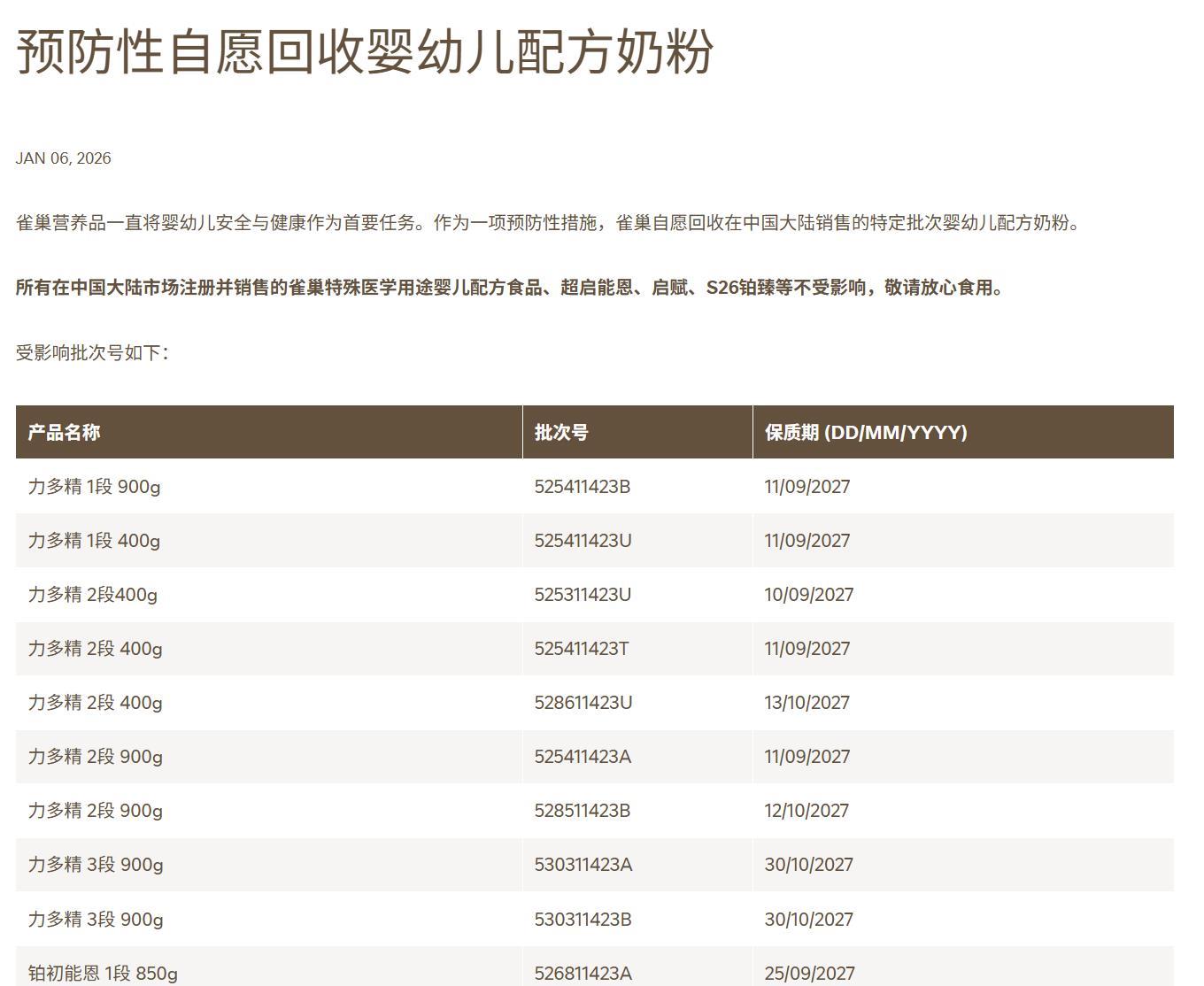 雀巢在通知中称,该举措完全出于预防考虑,因为涉及近期在相关批次所用的某一款供应商原料可能存在质量瑕疵。截至目前,尚未收到与相关产品有关的任何不适报告。尽管如此,出于高度谨慎,雀巢决定根据严格的产品质量与安全管理规范,进行本次自愿回收。如消费者已购买特定批次产品,请勿将其喂食给孩子,请致电客户服务热线。
