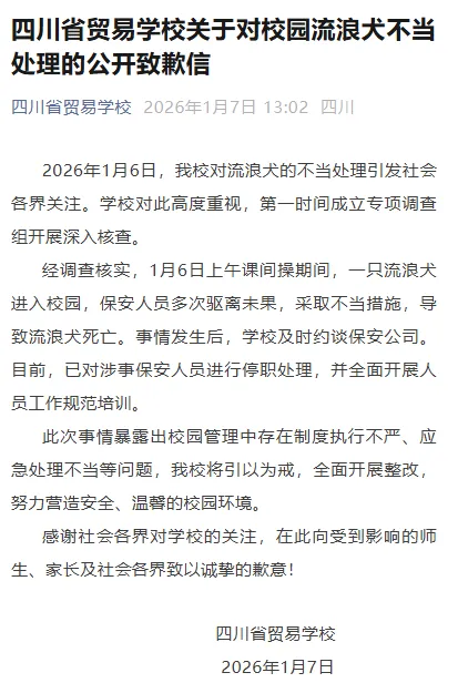 1月7日,四川省贸易学校发布关于对校园流浪犬不当处理的公开致歉信: