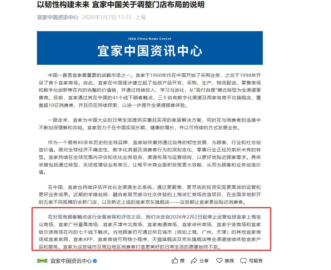 7日,宜家中国公开宣布,在对现有顾客触点进行全面审视和评估之后,决定自2026年2月2日起停止运营包括宜家上海宝山商场、宜家广州番禺商场、宜家天津中北商场、宜家南通商场、宜家徐州商场、宜家宁波商场和宜家哈尔滨商场在内的七个线下触点。当地顾客仍可通过所在城市(例如上海、广州、天津)的其他宜家商场或宜家官网、宜家APP、宜家微信可购物小程序、天猫旗舰店及京东旗舰店等全渠道继续体验宜家产品和服务。