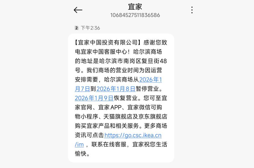 7日下午,极目新闻记者致电宜家中国客服获悉,因运营安排需要,宜家天津中北商场和宜家哈尔滨商场从2026年1月7日到2026年1月8日暂停营业。2026年1月9日恢复营业。