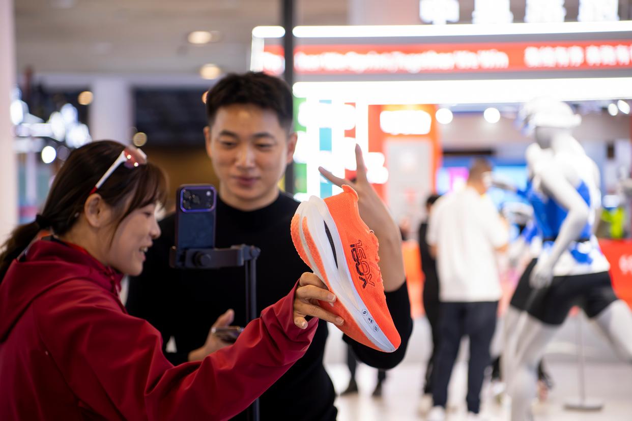 1月8日,两名体育用品企业工作人员在博览会现场利用电商平台直播推销运动鞋。新华社记者 魏培全 摄