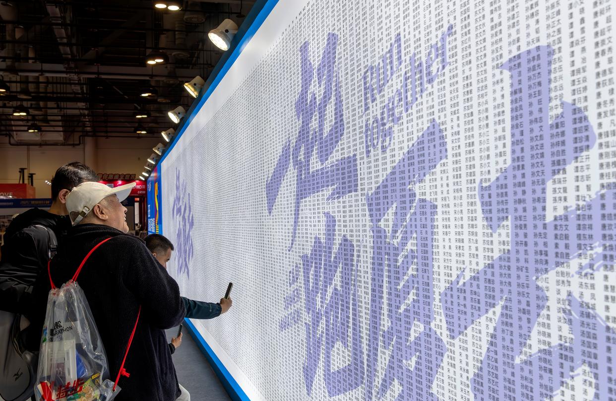 1月8日,参加厦门马拉松赛的选手在博览会厦门马拉松跑者姓名墙上寻找自己的名字。新华社记者 魏培全 摄