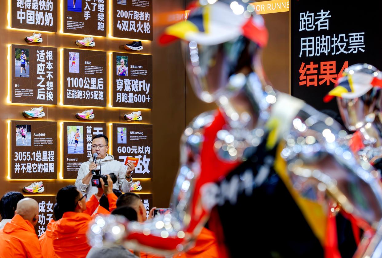 1月8日,一家体育用品厂商在博览会上推介自己的马拉松赛事体育用品。新华社记者 魏培全 摄