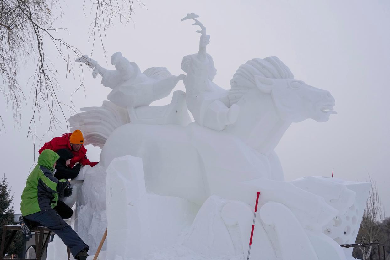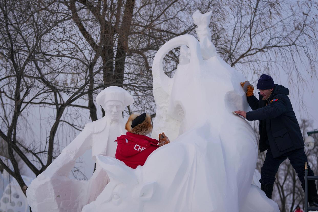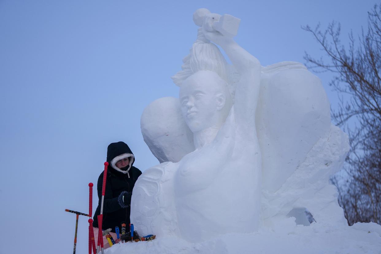 1月8日,在哈尔滨太阳岛雪博会第28届中国·哈尔滨国际雪雕比赛现场,选手进行雪雕创作。新华社记者 王建威 摄
