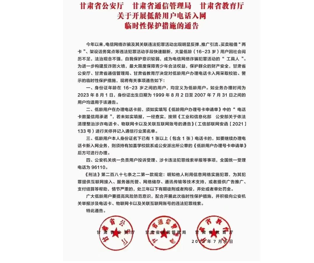 极目新闻记者也注意到,2023年,甘肃公安也曾发布通告称,2023年以来,电信网络诈骗及其关联违法犯罪活动出现明显反弹,推广引流、买卖租借“两卡”、架设话务窝点等违法犯罪活动手段快速翻新,大量低龄(16-23岁)用户因社会阅历不足,法治观念不强,自我保护意识较弱,成为电信网络诈骗犯罪活动的“工具人”。为进一步构建反诈防火墙,最大限度保障青少年合法权益,保护群众的财产安全,甘肃省公安厅、甘肃省通信管理局、甘肃省教育厅决定对低龄用户办理电话卡入网采取校验、警示的临时性保护措施,有关事项通告如下:
