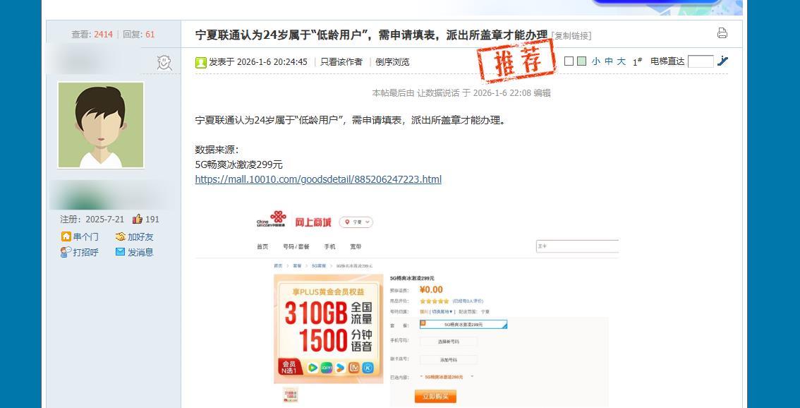 1月8日,极目新闻记者打开中国联通网上商城看到,一款“5G畅爽冰激凌299元”话费套餐的详情页提示:“若您未满24周岁,须本人持有加盖公安派出所公章的《低龄用户办理号码申请单》,方可进行办理。”该款套餐的供应商为宁夏联通。有网友认为,填申请表,公安机关盖章后,才能办电话卡,这给已步入社会,未满24岁的成年人一定程度上造成不便。