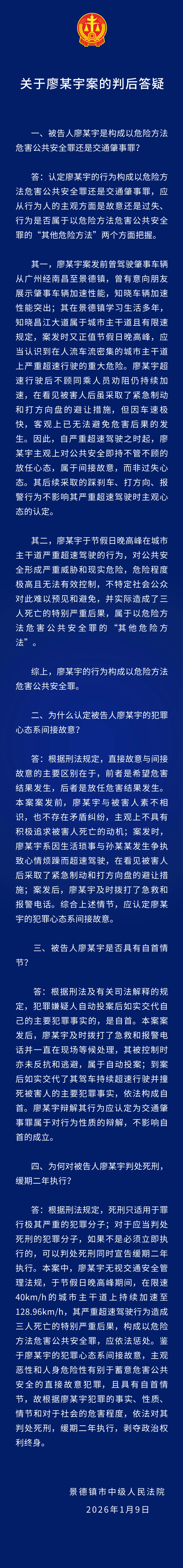1月9日,江西省景德镇市中级人民法院对被告人廖某宇以危险方法危害公共安全案一审公开宣判,对被告人廖某宇以以危险方法危害公共安全罪判处死刑,缓期二年执行,剥夺政治权利终身。