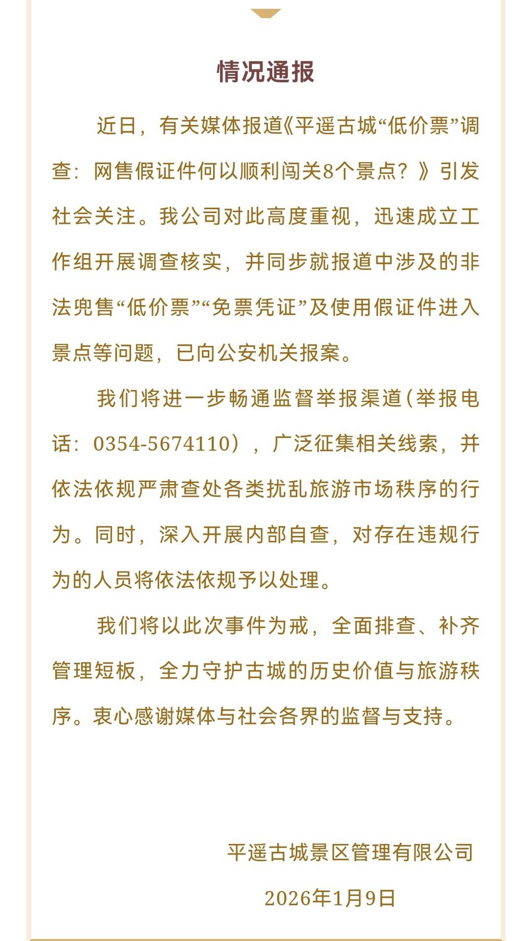 1月9日,平遥古城景区管理有限公司发布通报,表示已成立工作组自查,并针对非法兜售“低价票”“免票凭证”及使用假证件逃票进入景点问题报案。