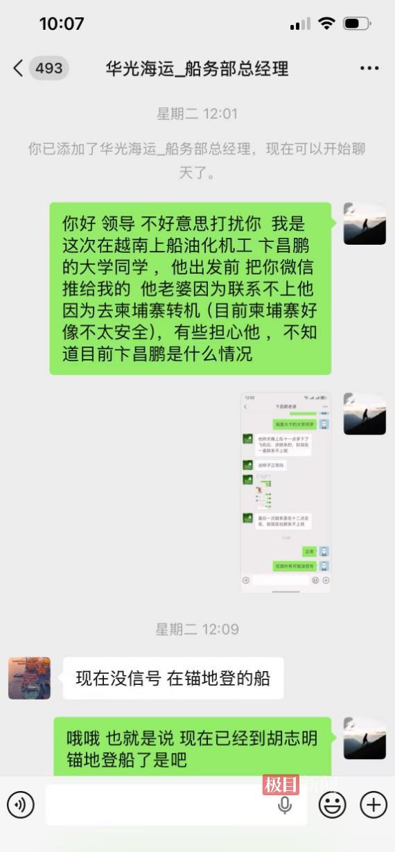 唐先生说,船员只要上船工作,船东公司就会给水手在系统上登记任职记录。据他的从业经历,远洋船上会有各种各样的通信设备,不会出现好几天无法联系家里的情况,“根据卞昌鹏描述的过程,之前的一系列流程感觉都是正常的,但之后就不正常了。得到消息后,好几个大学同学都给他发了信息,他除了给他爱人回了电话,一直没有回复我们。”