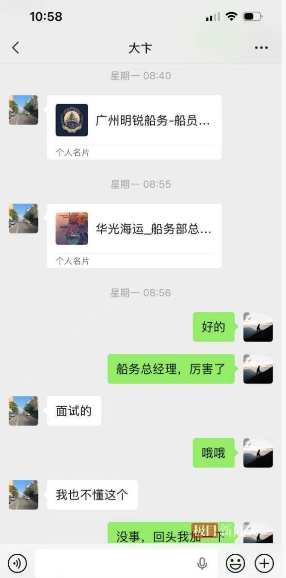 卞昌鹏的大学室友唐先生告诉极目新闻记者,毕业后卞昌鹏跑了一条船后就开始做生意了,因为今年经济压力大,他又想继续跑船,还去参加了培训。去年12月初,卞昌鹏希望联系上远洋船,但一直没有成功,于是唐先生帮他在两个行业招聘网站上挂了简历。