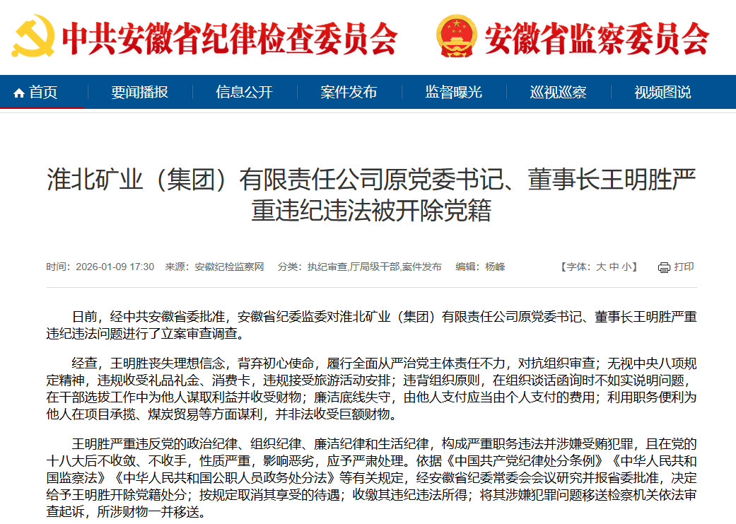 日前,经中共安徽省委批准,安徽省纪委监委对淮北矿业(集团)有限责任公司原党委书记、董事长王明胜严重违纪违法问题进行了立案审查调查。
