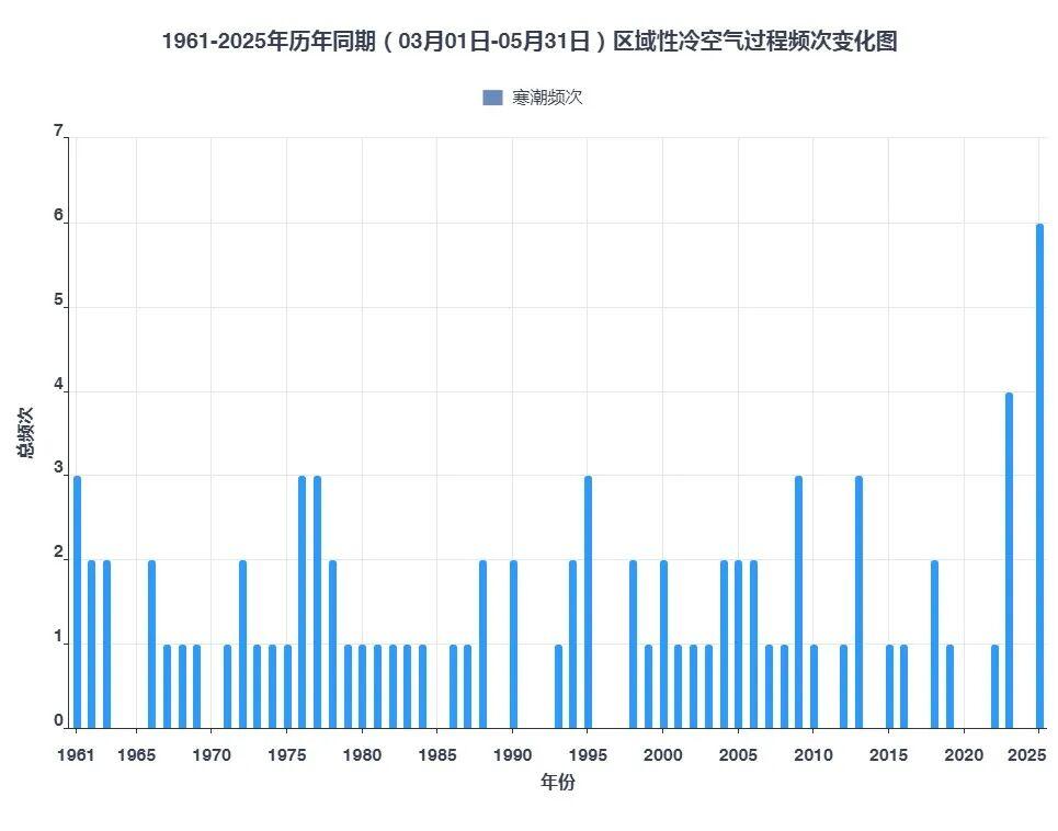 图10 陕西省1961-2025年春季区域性寒潮过程频次变化