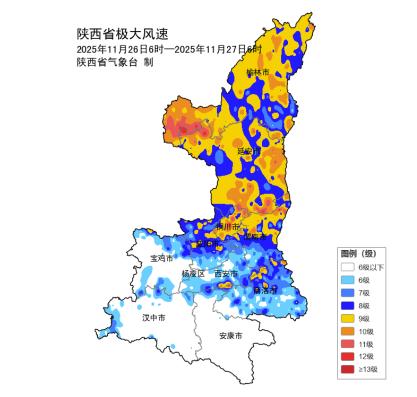 图9 陕西省2025年11月26日06时-27日06时最大风速实况图