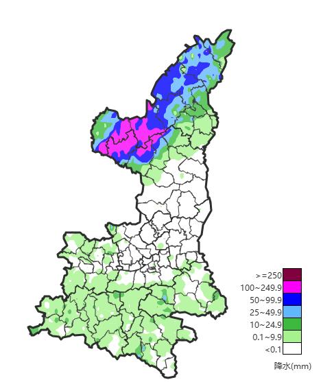 7月25-26日陕北出现强降水,榆林和延安北部共13站累计雨量超过200毫米。此次降水极端性强、降水时段集中,9个区域站日降水量突破建站以来极值。25日为降水最强时段,定边新安边日降水量达264.5毫米,吴起铁边城达230.9毫米,日雨量接近或超年平均降水量的一半。降水造成吴起县部分街道被淹、商铺房屋进水,主城区、铁边城镇、吴仓堡镇等地区部分电力设施受损。降雨还导致北洛河流域接连拉响警报,干支流出现超警戒洪峰流量。