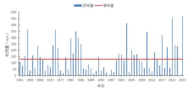 图1 陕西省1961-2025年秋雨量逐年变化