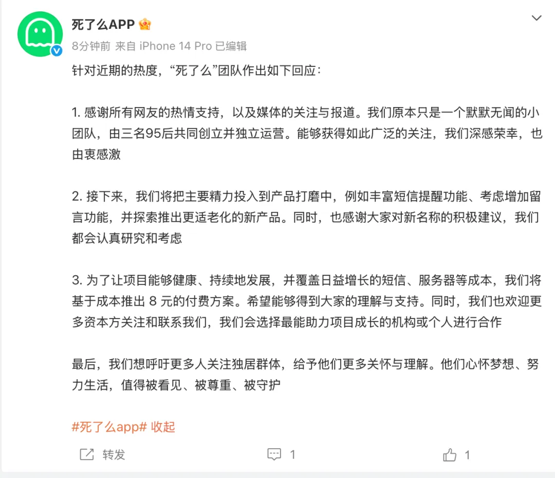 1月11日,@死了么APP发文,针对近期的热度,“死了么”团队作出如下回应:
