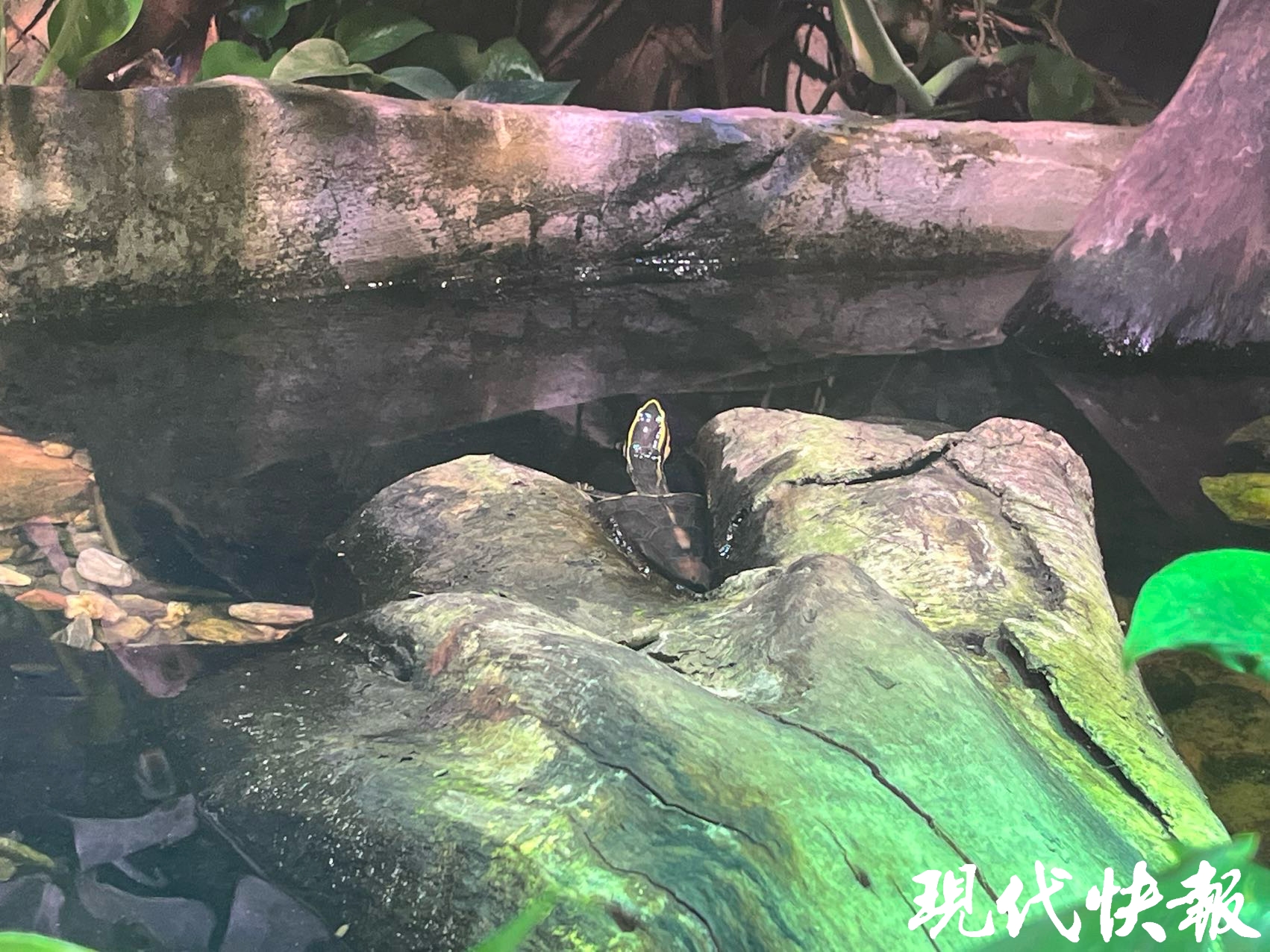 为了让这位“顶流”住得舒心,园方可是下足了功夫,量身打造了一个“原生态豪宅”:高低错落的植被营造出静谧氛围,专属水塘水温恒定在28℃左右,明确划分深水区与浅水区——深水区为其提供充足的游泳与躲藏空间,浅水区则用碎石堆筑缓坡,便于其顺利上岸活动。此外,水塘中还引入鳑鲏等小型鱼类,既为线纹闭壳龟的生活增添生机,也构建起微型水域生态循环系统。