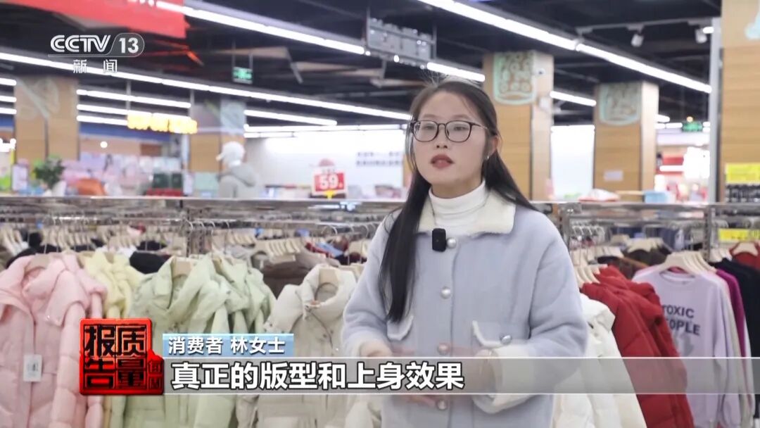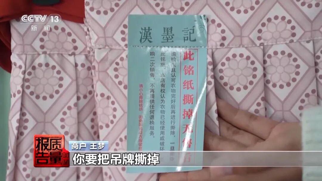 消费者林女士:现在的衣服的吊牌越做越大,经常会挡住衣服的一些重要部位,比如说领口、胸前或者腰间,让我们看不出衣服的真正的版型和上身效果,这样子看起来挺不舒服的。