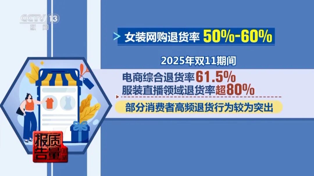 数据显示,女装网购退货率普遍徘徊在50%至60%之间。2025年“双11”期间,电商综合退货率为61.5%,仍处于高位水平,其中服装直播领域退货率超80%,部分消费者高频退货行为较为突出。