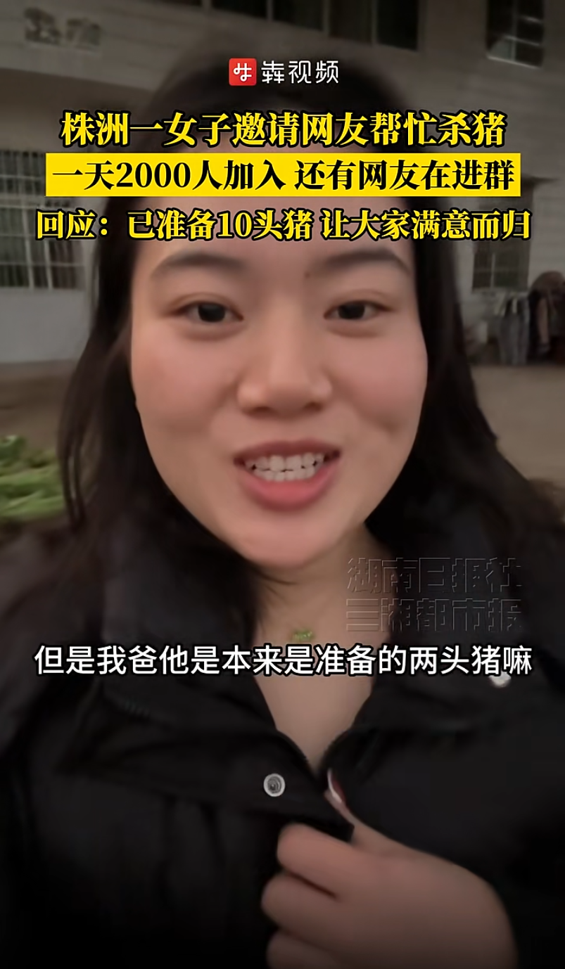 重庆合川女子"呆呆"家里要杀猪,她怕七旬老爹按不住两头年猪,在网上喊了句"来帮忙就管刨猪汤",本想要几个邻里搭把手,结果5个500人群一夜爆满。