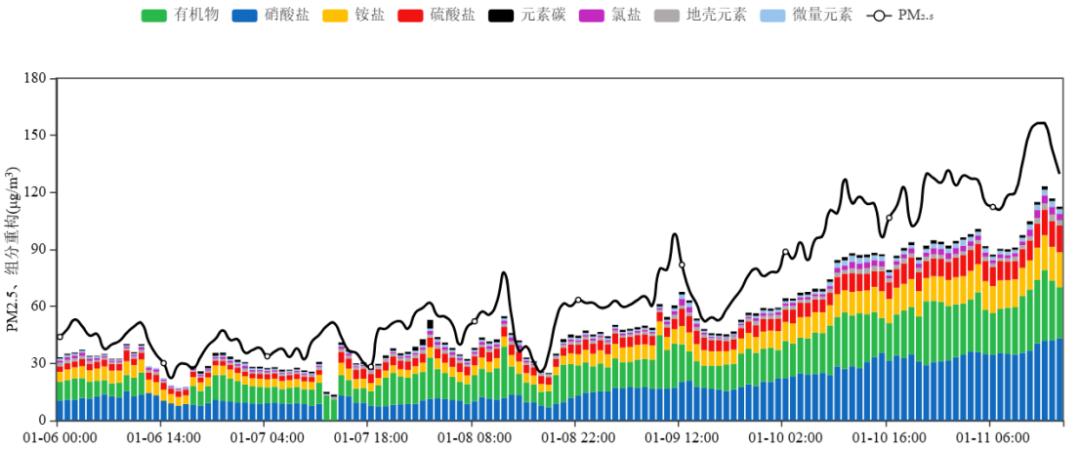 从地面气象要素看,1月8日起,气压持续走低,无明显冷空气影响,盆地内气温持续缓慢升高,白天天空拉开,垂直扩散条件较好,相对湿度降至40%以下,但夜间相对湿度仍接近饱和状态,近地面风速降至2m/s以下,大气趋于静稳,污染物浓度逐渐累积。11日转阴,湿度增大,最低相对湿度仍维持在70%以上,叠加边界层高度降至500m以下,不利于污染物扩散,颗粒物吸湿增长及二次转化作用增强,累积速率加快。