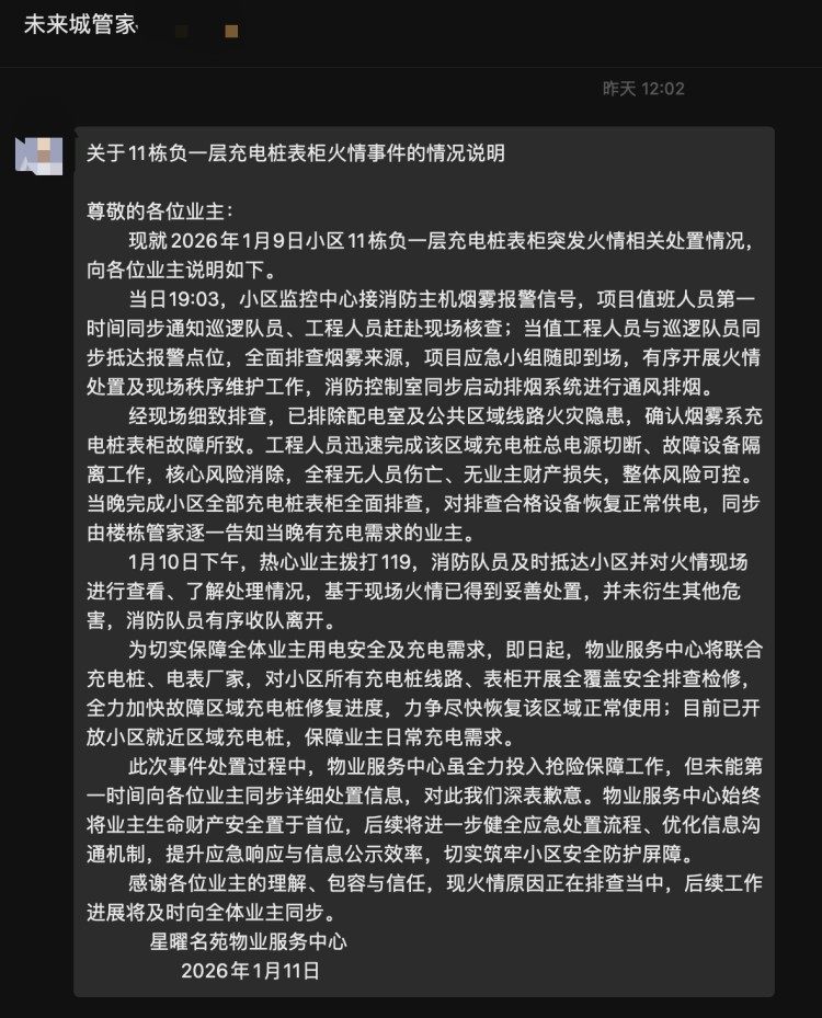 截图显示,宋先生所在楼栋管家称,物业服务中心第一时间完成了紧急处置工作。目前,专业人员正对事故原因展开调查,物业服务中心将跟进,调查进展以及充电桩表柜后续的恢复使用计划于1月14日18点前向全体业主详细通报。