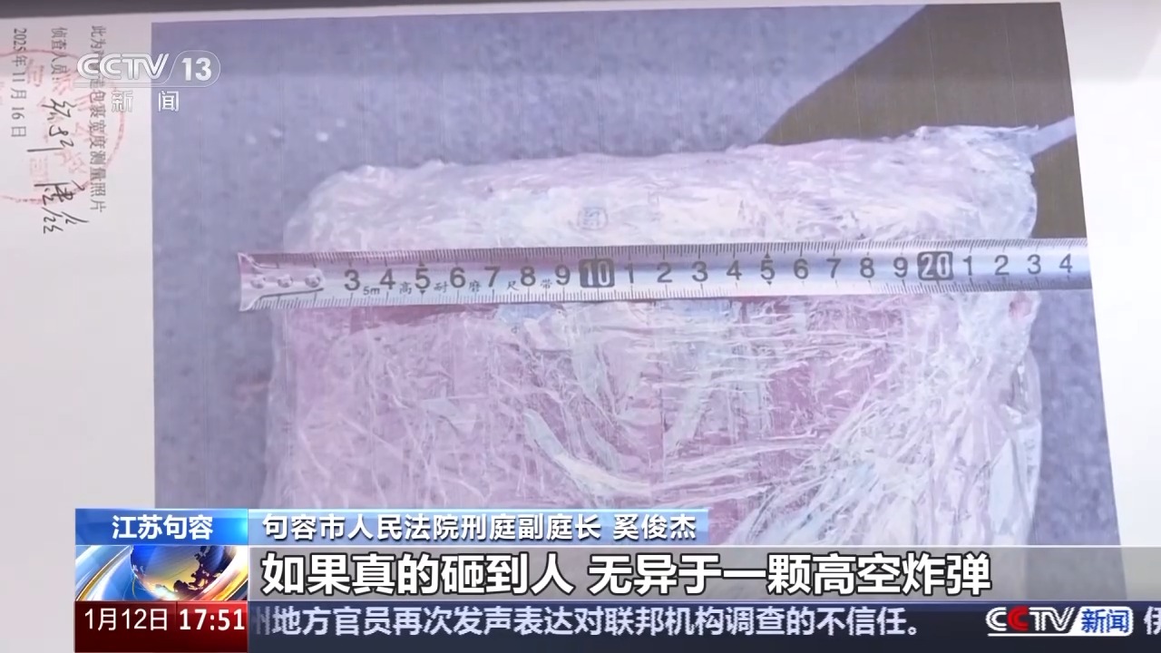 句容市人民法院刑庭副庭长 奚俊杰:经过公安机关测量,被扔下的包裹是硬质的折叠书桌。将近50米高的地方落下一个将近重达15斤的东西,如果真的砸到人,无异于一颗高空炸弹。
