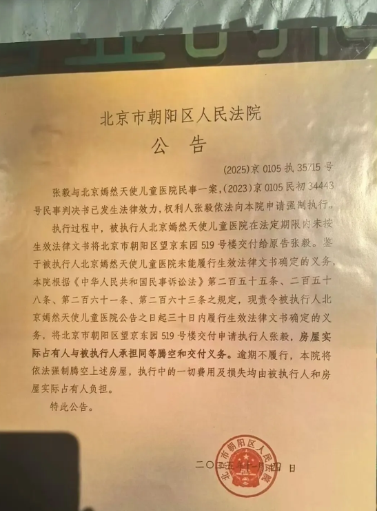 2025年11月4日,北京市朝阳区法院在嫣然医院门口张贴公告,责令医院自公告之日起三十日内履行生效法律文书确定的义务,将北京市朝阳区望京东园519号楼交付申请执行人。