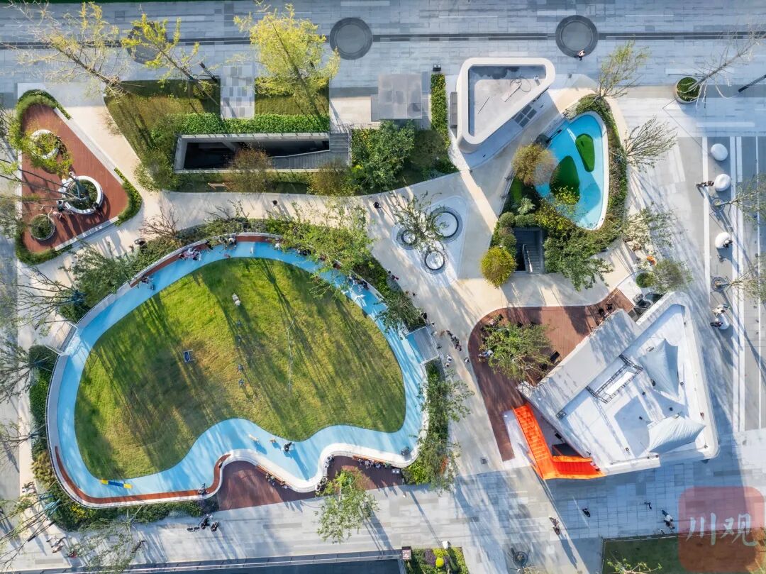 canpet犬岛公园位于保利时光里商圈,从外部看,像是在商圈中央广场上“圈”出一块区域,打造成一个占地1800平方米的小型公园。以“岛”为设计理念,公园内设置了下沉式的放绳草坪、零售、洗护等多个功能分区,包含室内与室外两部分空间,以此满足宠主和爱犬的运动、社交需求。