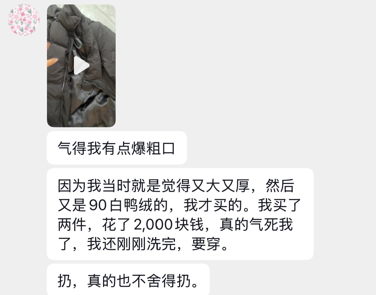 消费者晒图称花2000元钱,却买到两件飞丝羽绒服。