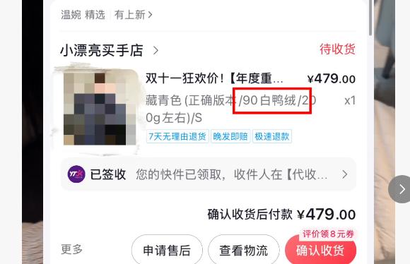 消费者晒出在“温婉”店铺购买的飞丝羽绒服。