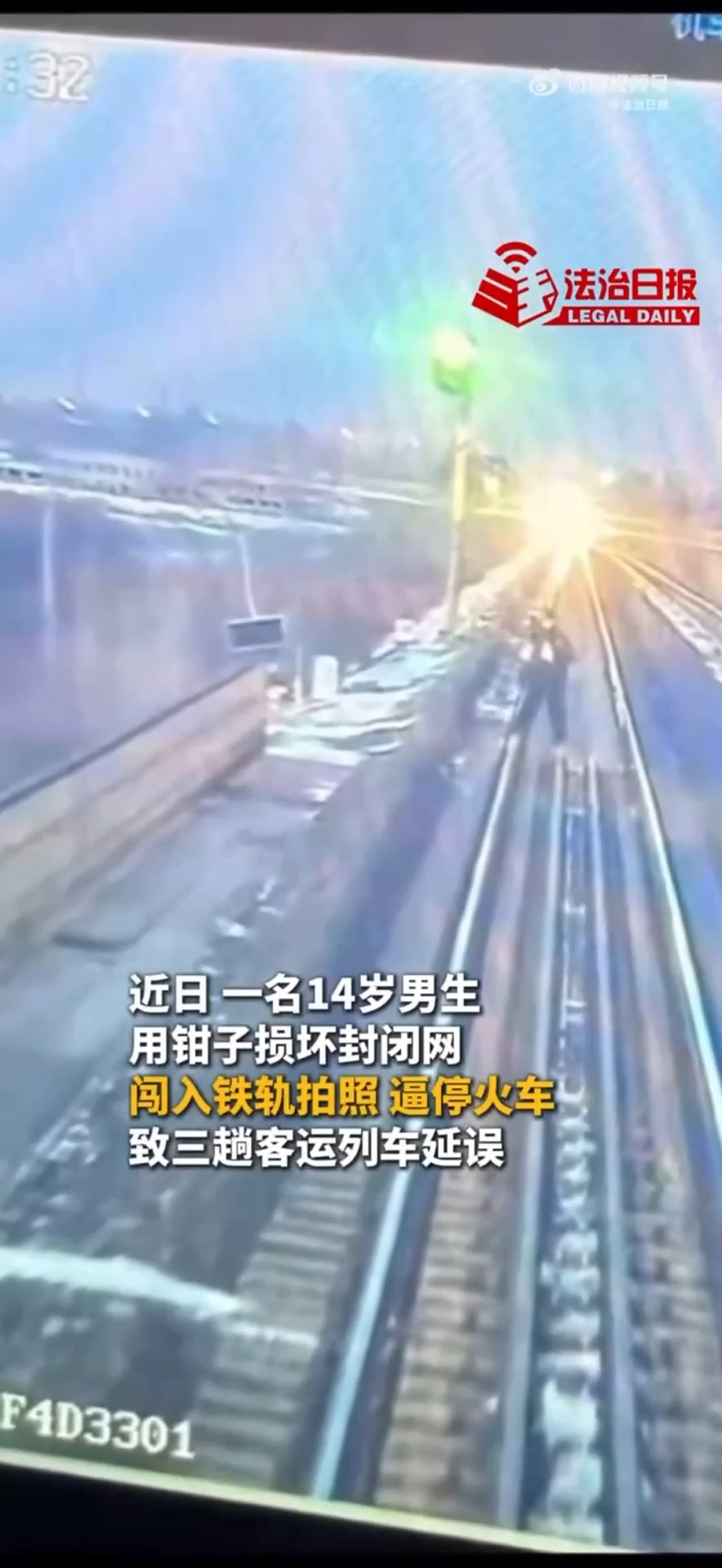 日前,一则“14岁男生闯入铁轨拍照逼停火车”的新闻冲上热搜。报道显示,该男生用钳子损坏封闭网,在铁轨上拍摄迎面而来的火车,直到火车鸣笛示警后才走下铁轨,火车紧急制动缓缓停下,火车头距离男生所站位置仅有数米,事后,男生还想爬上驾驶室但被司机阻止。