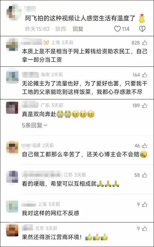 “你搞的那个菜,为什么搞得那么好吃啊,跟我们那里差不多。”被网友亲切称为“贵州子涵”的贵州工人曾信金是最早被张腾飞这份实在打动的人,他用带着乡音的普通话再次向记者表达对张腾飞和饭菜的肯定。