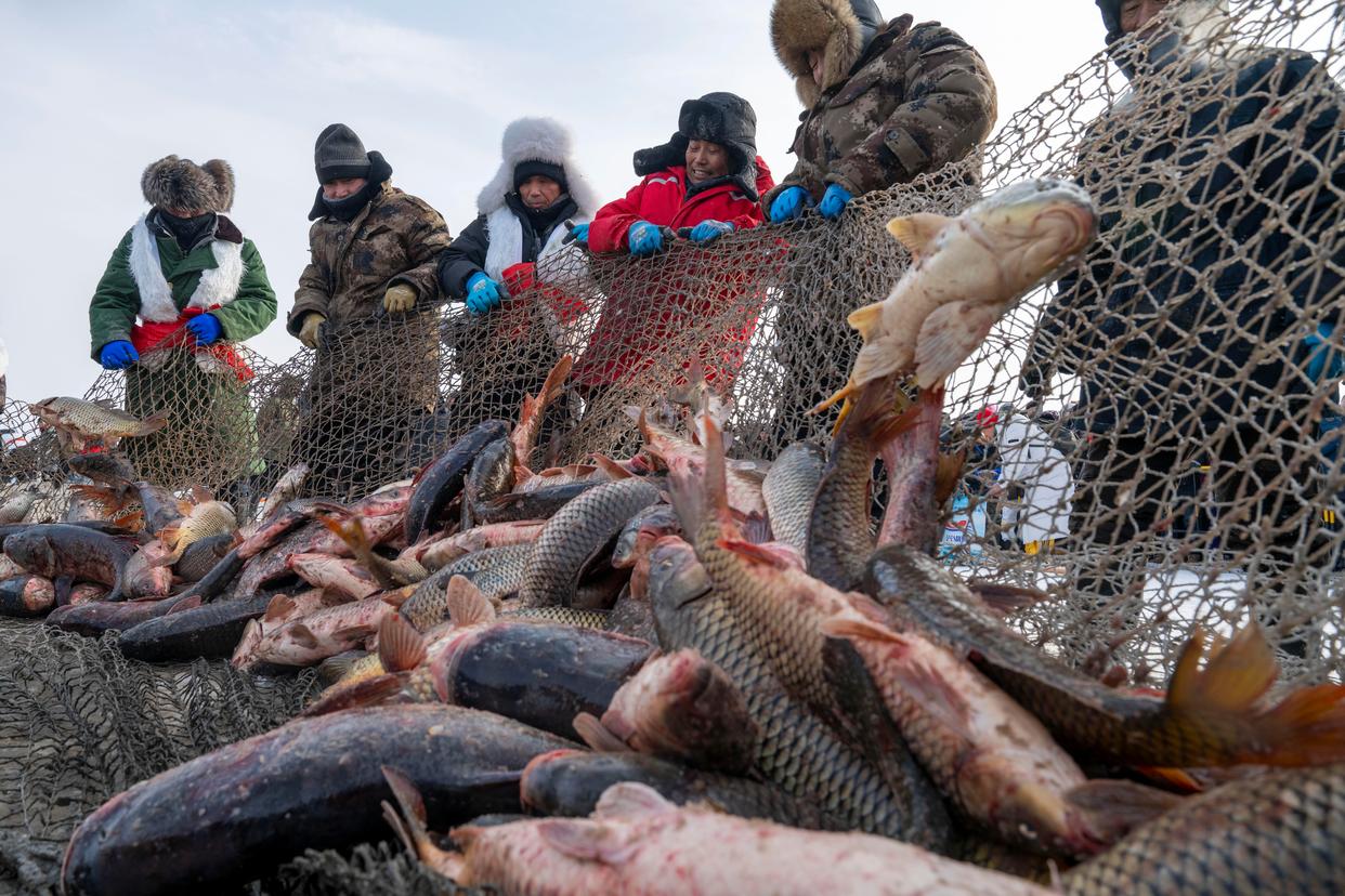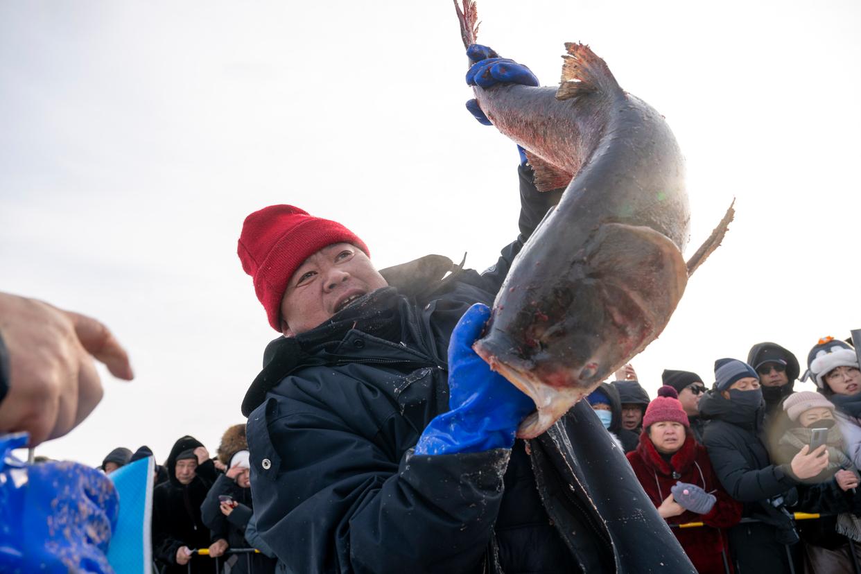 1月17日,在2026年兴凯湖冬捕节现场,渔民展示刚刚冬捕上来的鱼。新华社记者 张涛 摄
