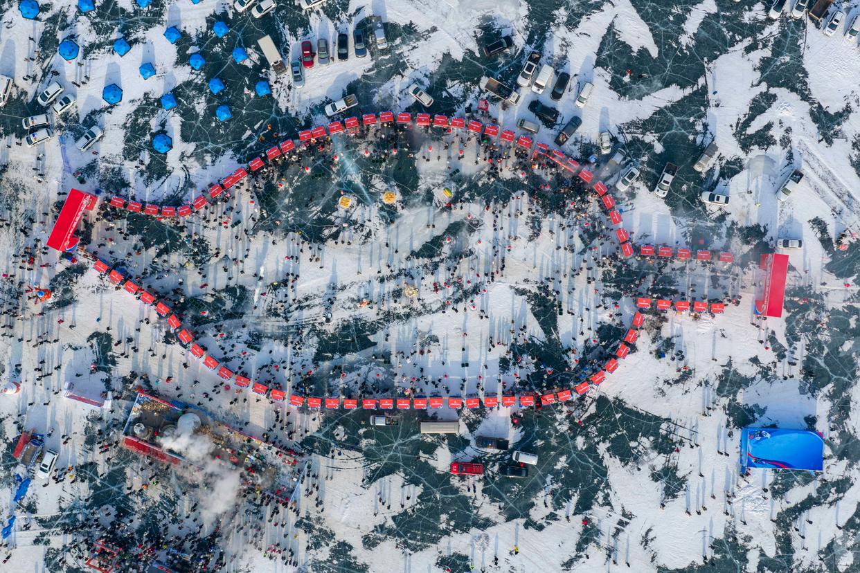 这是1月17日拍摄的2026年兴凯湖冬捕节现场(无人机照片)。新华社记者 张涛 摄