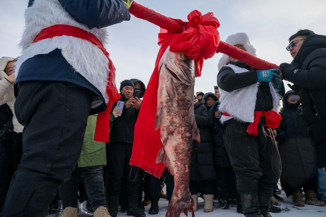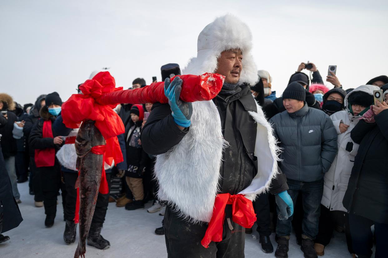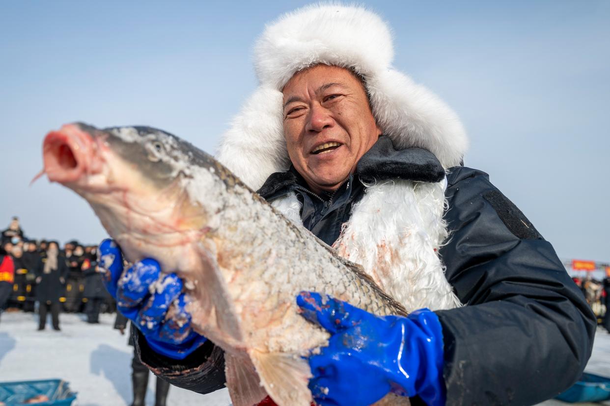 1月17日,在2026年兴凯湖冬捕节现场,渔民展示冬捕的大鱼。新华社记者 张涛 摄