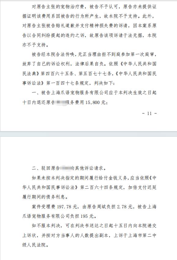 法院判决,被告上海爪语宠物服务有限公司应于判决生效之日起十日内退还原告服务费用15800元;驳回原告的其他诉讼请求。