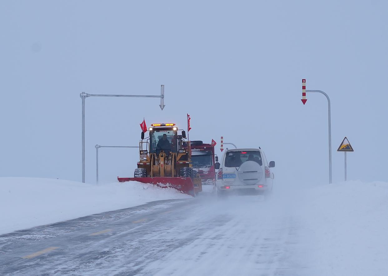 1月13日,新疆阿勒泰公路事业发展中心工作人员驾驶清雪车在辖区公路上除雪。新华社发(毛林别克·胡尔买提汗 摄)