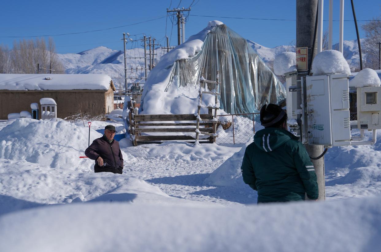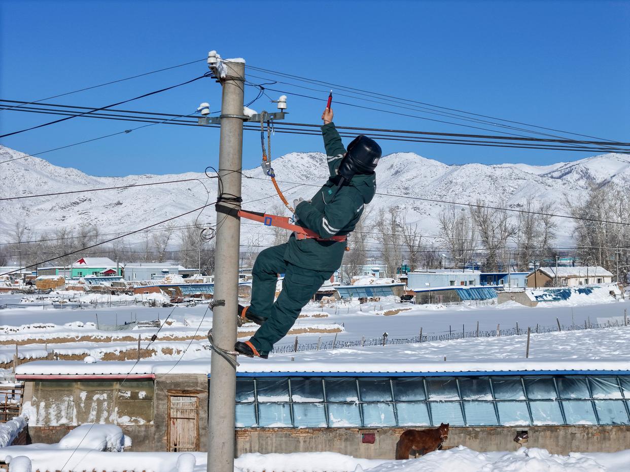 1月16日,吐尔洪乡供电所员工在巡检路上。新华社发(努尔别克·努尔曼 摄)