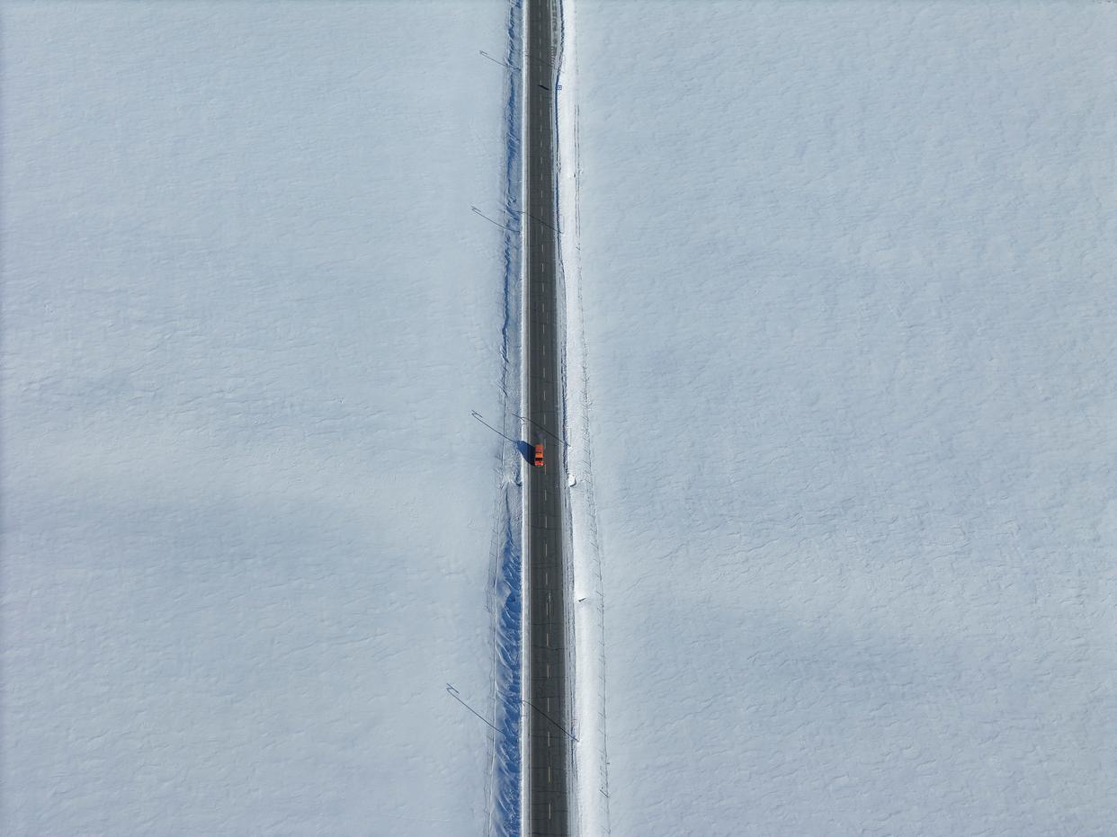 1月17日,车辆行驶在由富蕴县城通往可可托海镇的公路上(无人机照片)。新华社记者 胡虎虎 摄
