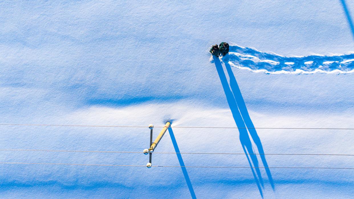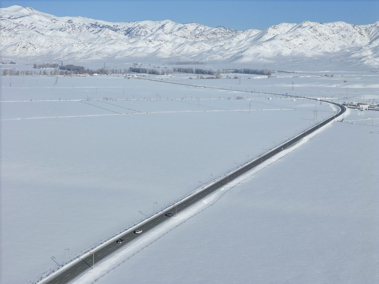 1月16日,吐尔洪乡供电所员工在巡检路上(无人机照片)。新华社发(努尔别克·努尔曼 摄)