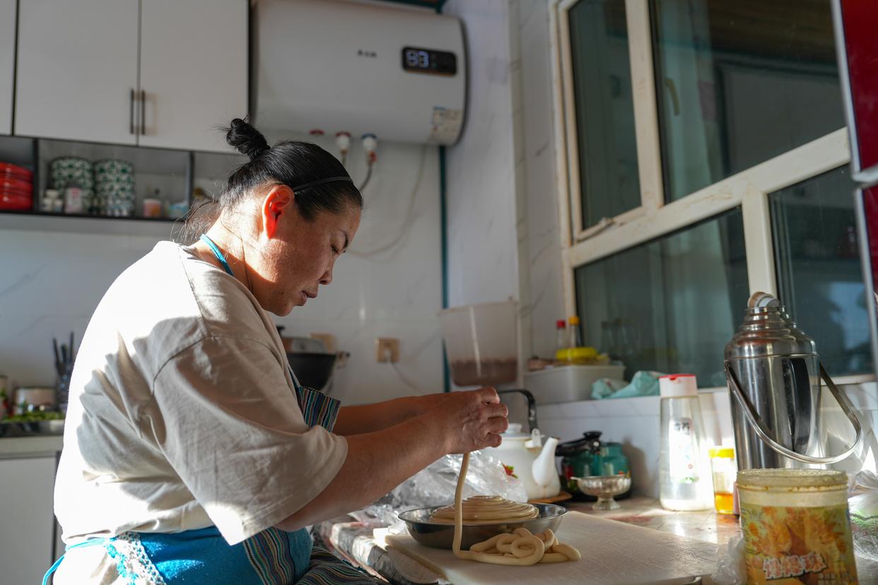 1月16日,吐尔洪乡的村民在家中制作面食。新华社记者 胡虎虎 摄