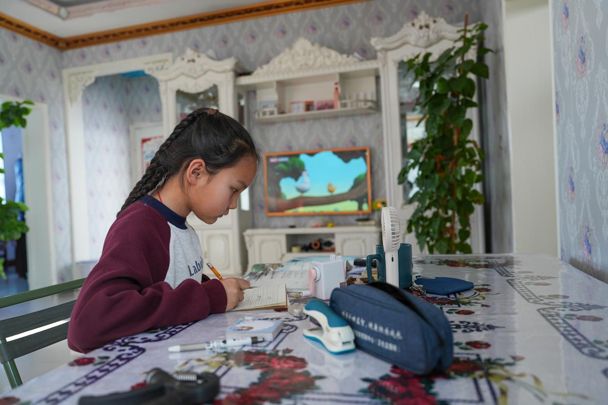 1月16日,在吐尔洪乡康阔勒特克村,小学生哈拉哈提·朱马别克在家中抄写古诗。新华社记者 胡虎虎 摄