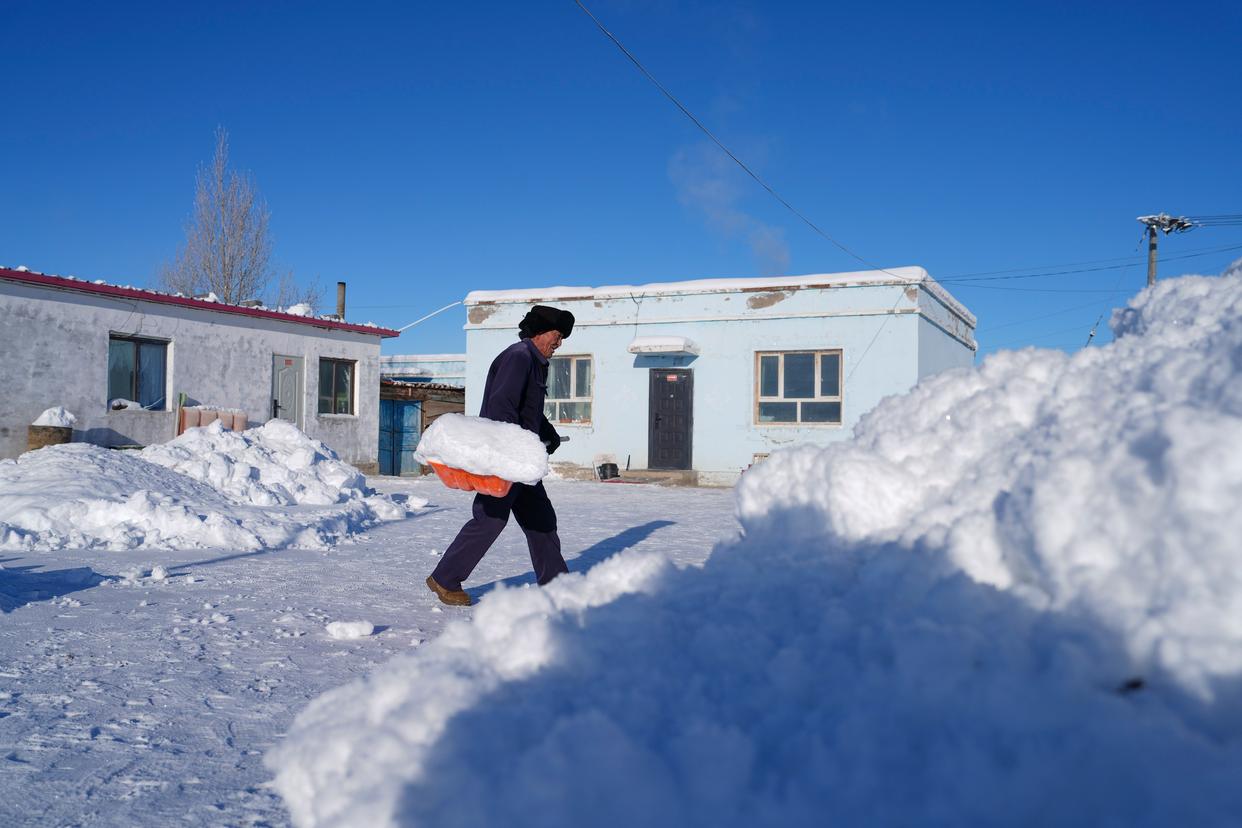 1月16日,吐尔洪乡的村民在门前小院内清理积雪。新华社记者 胡虎虎 摄