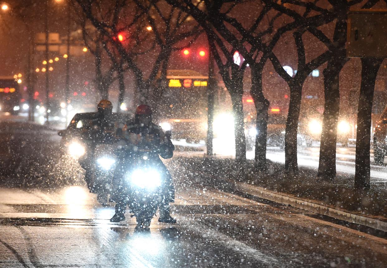 1月17日,市民在北京长安街冒雪出行。新华社记者 罗晓光 摄